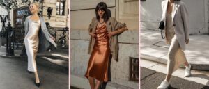 - A bias-cut satin dress with a relaxed blazer
