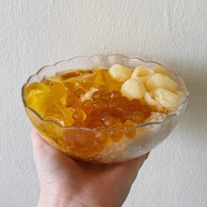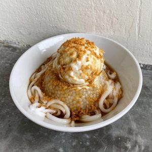 This refreshing, chilled dessert combines the smoothness of sago with the rich sweetness of gula melaka, complemented by a decadent coconut soy ice cream. Adding a unique twist, it’s topped with delicate coconut noodles and finished off with a sprinkle of roasted coconut flakes, delivering a satisfying crunch with every bite. Indulge in this creamy, aromatic, and delightfully textural experience. A must-try for coconut lovers!